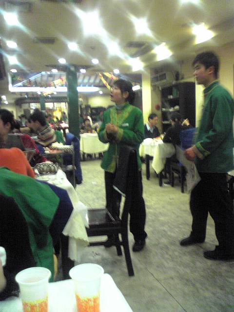 緑色の制服を着た従業員(服務員)は多く、テーブルの準備、