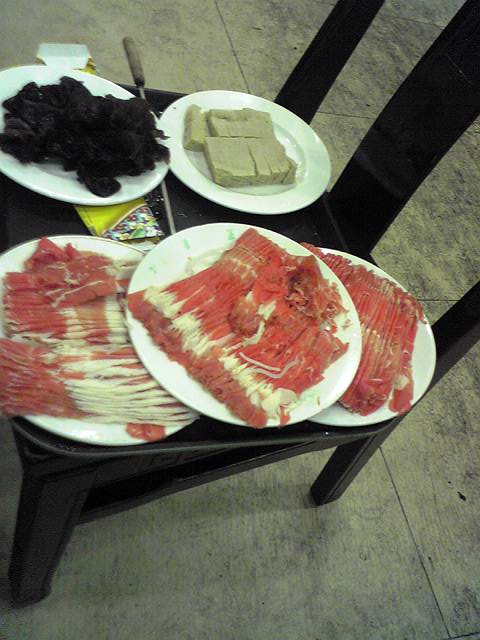 鍋がテーブルに用意され、材料が次々と運ばれてきます。